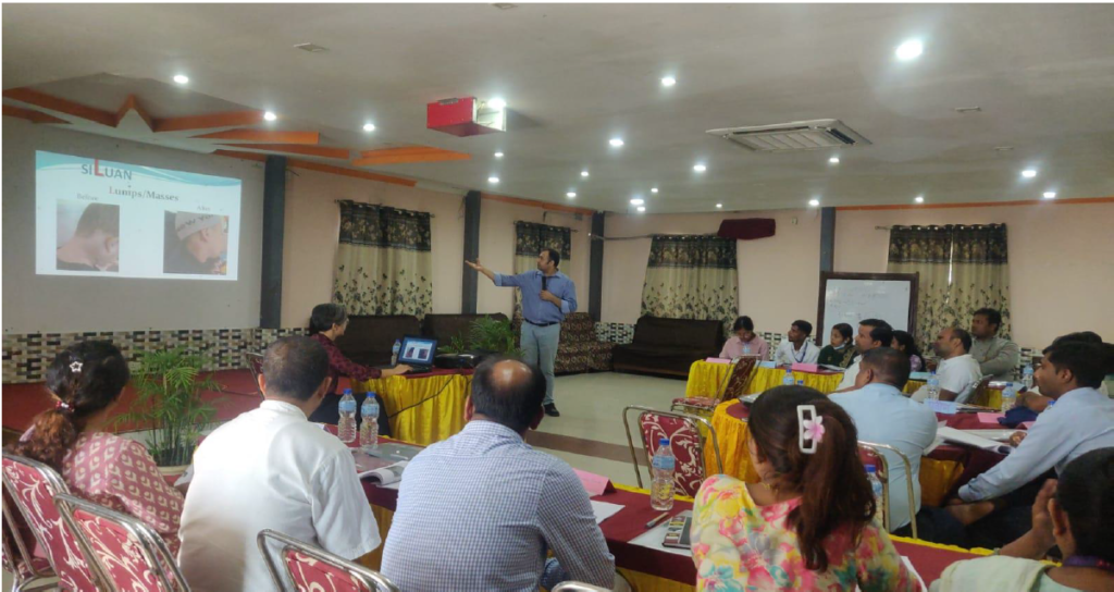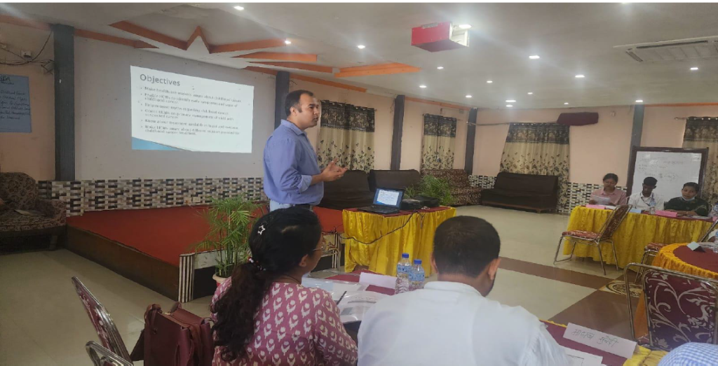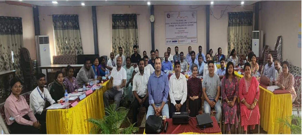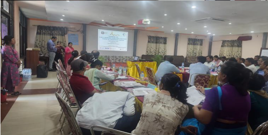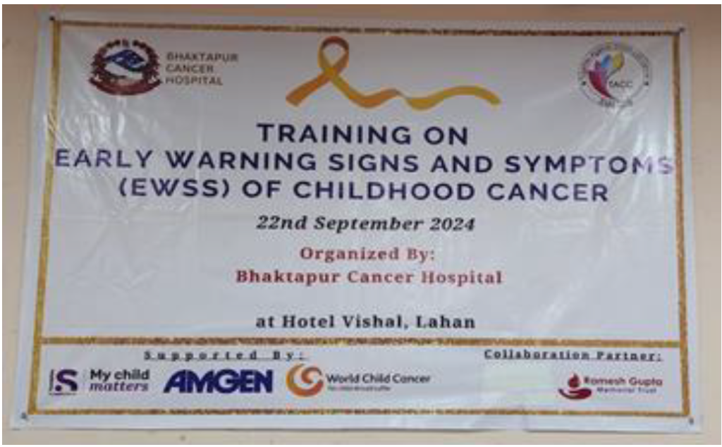 This training was organized on 2081/06/06 (22nd September 2024) at Hotel Vishal, Lahan, Siraha, Nepal. It was organized by Bhaktapur Cancer Hospital in Collaboration with Kanti Children`s Hospital with support from Together Against Childhood Cancer (TACC), Ramesh Gupta Memorial Trust (RGMT) and World Child Cancer (WCC).