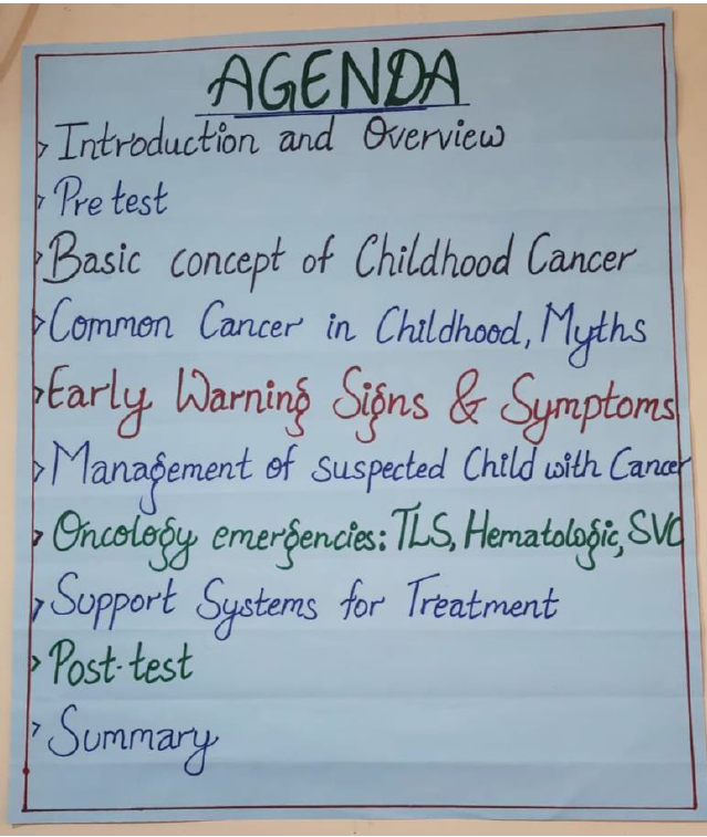 The estimated number of new children suffering from cancer is around 2000-2500 per year in Nepal. Only a fraction of the total estimated pediatric cancer patients reaches Kanti Children`s Hospital, Bhaktapur Cancer Hospital, Patan Academy of Health Sciences and BP Koirala Memorial Cancer Hospital each year. Signs and symptoms of childhood cancer being mostly non-specific and many myths existing in the community, we were prompted to conduct orientation training regarding childhood cancer and its early detection among the grass-root level health workers. With eleven such trainings already conducted elsewhere, Siraha and Saptari were chosen as the twelfth site for this training program for creating awareness and smooth running of Shared care center to be established in Madhesh province.